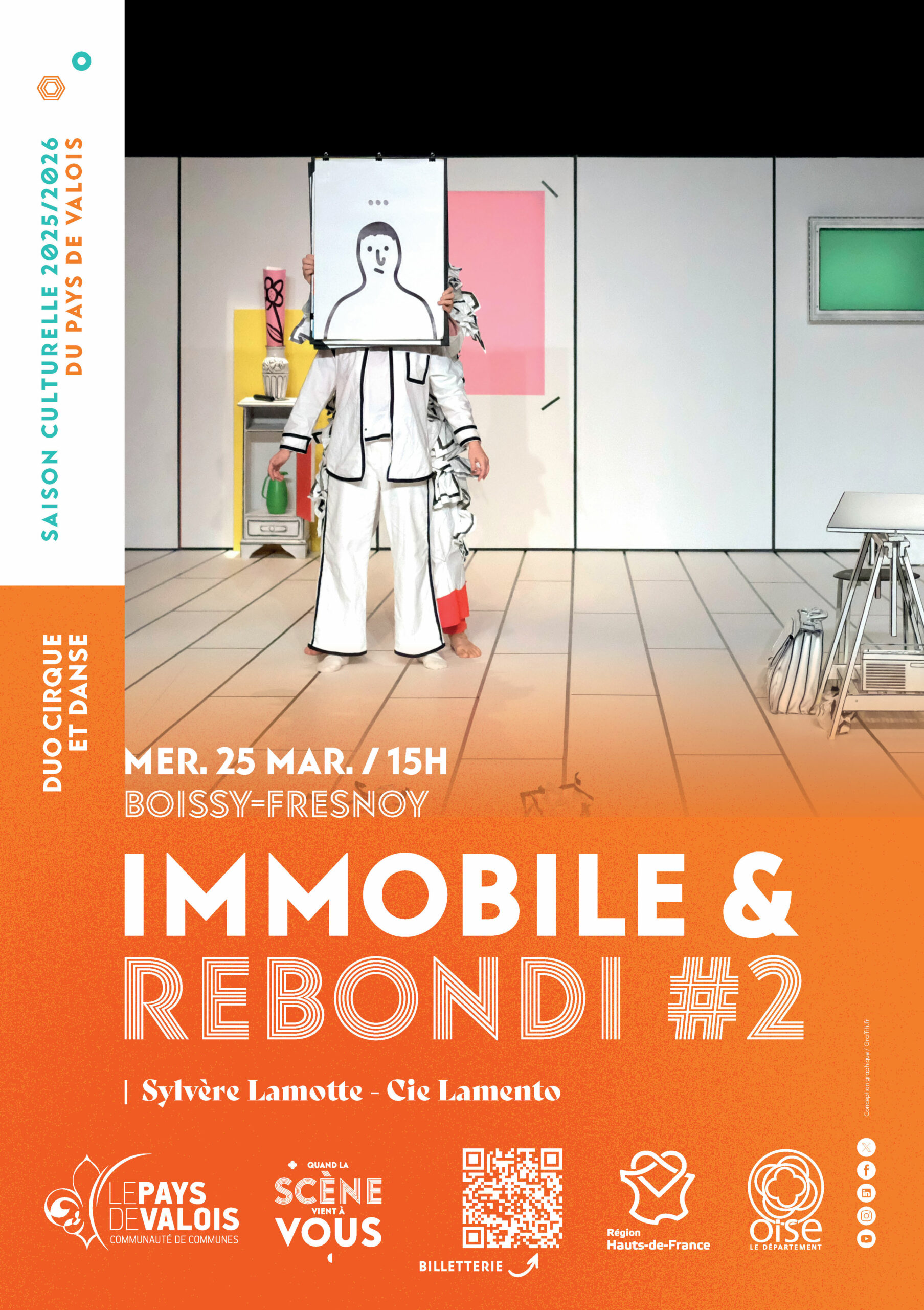 « Immobile » est en panne d’inspiration et elle broie du noir. Alors que « Rebondi » déborde d’idées ; bonnes ou mauvaises qu’importe, elles ont le mérite d’exister ! Tout semble les opposer et pourtant, ils vont se reconnaître, apprendre à reconsidérer l’erreur, à l’apprécier et à s’en servir pour rebondir. Après une version dessinée-dansée, l’illustratrice Betty Bone et le chorégraphe Sylvère Lamotte ont souhaité voir évoluer les personnages vers le Cirque. La contorsion et l’équilibre se révèle une fine transcription physique du caractère d’Immobile, avec son corps tortueux qui tente de s’échapper par la verticalité ; alors que Rebondi, jongle et danse avec les idées. Un duo virtuose et poétique, imaginé comme une ode à nos errances…